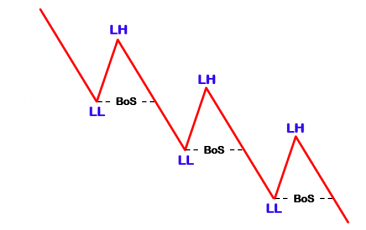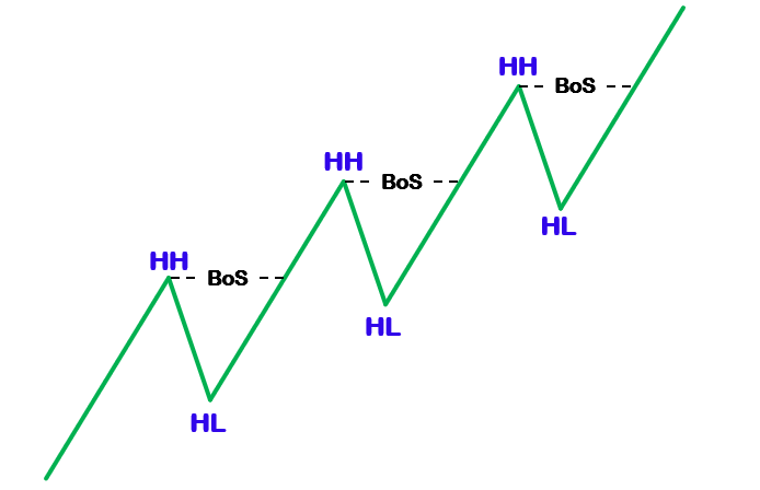 BOS زمانی رخ میدهد که بازار یک سقف یا کف مهم را شکسته و بالای/زیر آن تثبیت شود که نشانهای از “تغییر روند معتبر” است. شکست سقف مهم و تثبیت بالای آن نشاندهنده روند صعودی، و شکست کف مهم و تثبیت زیر آن نشاندهنده روند نزولی است.